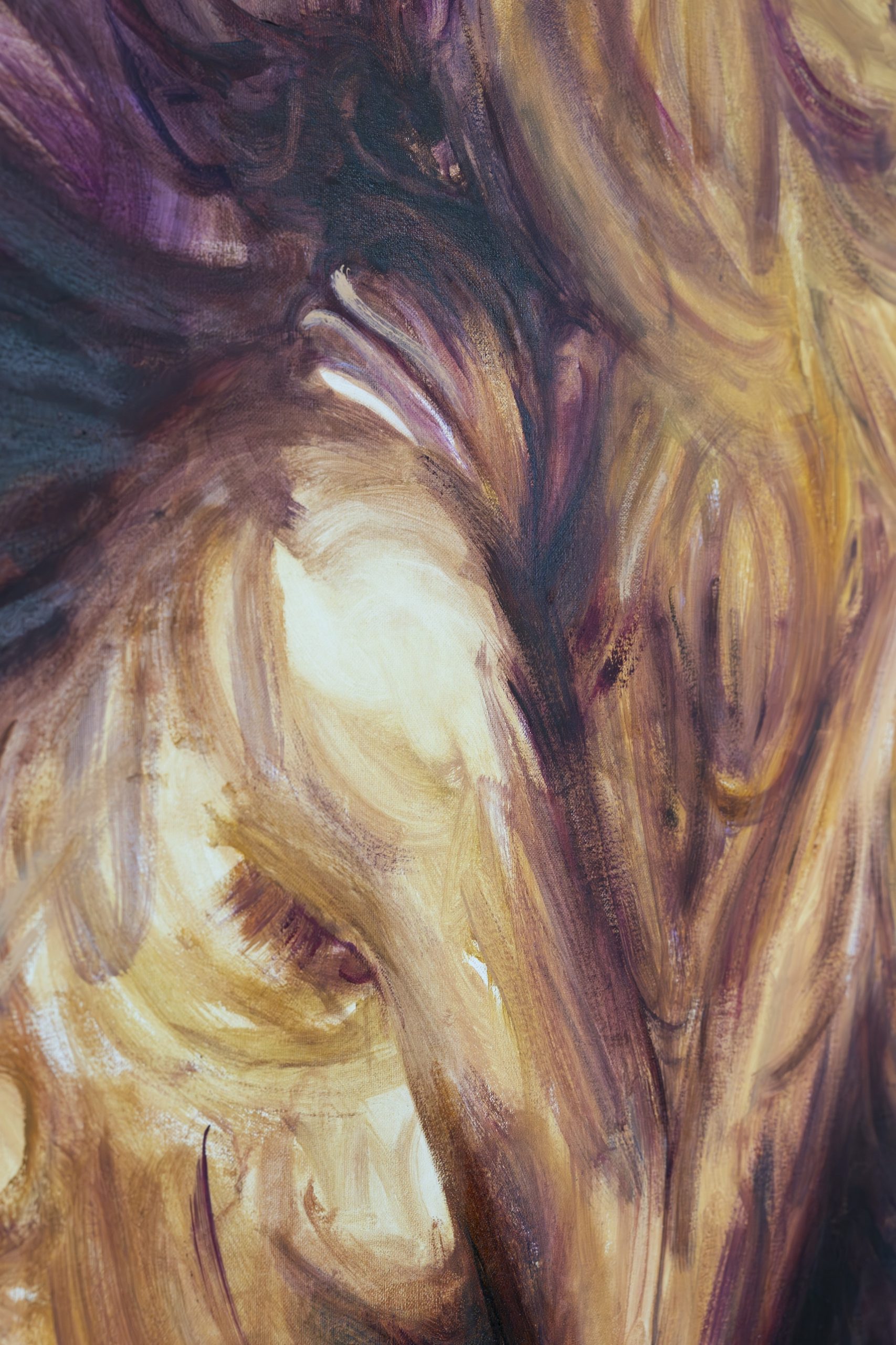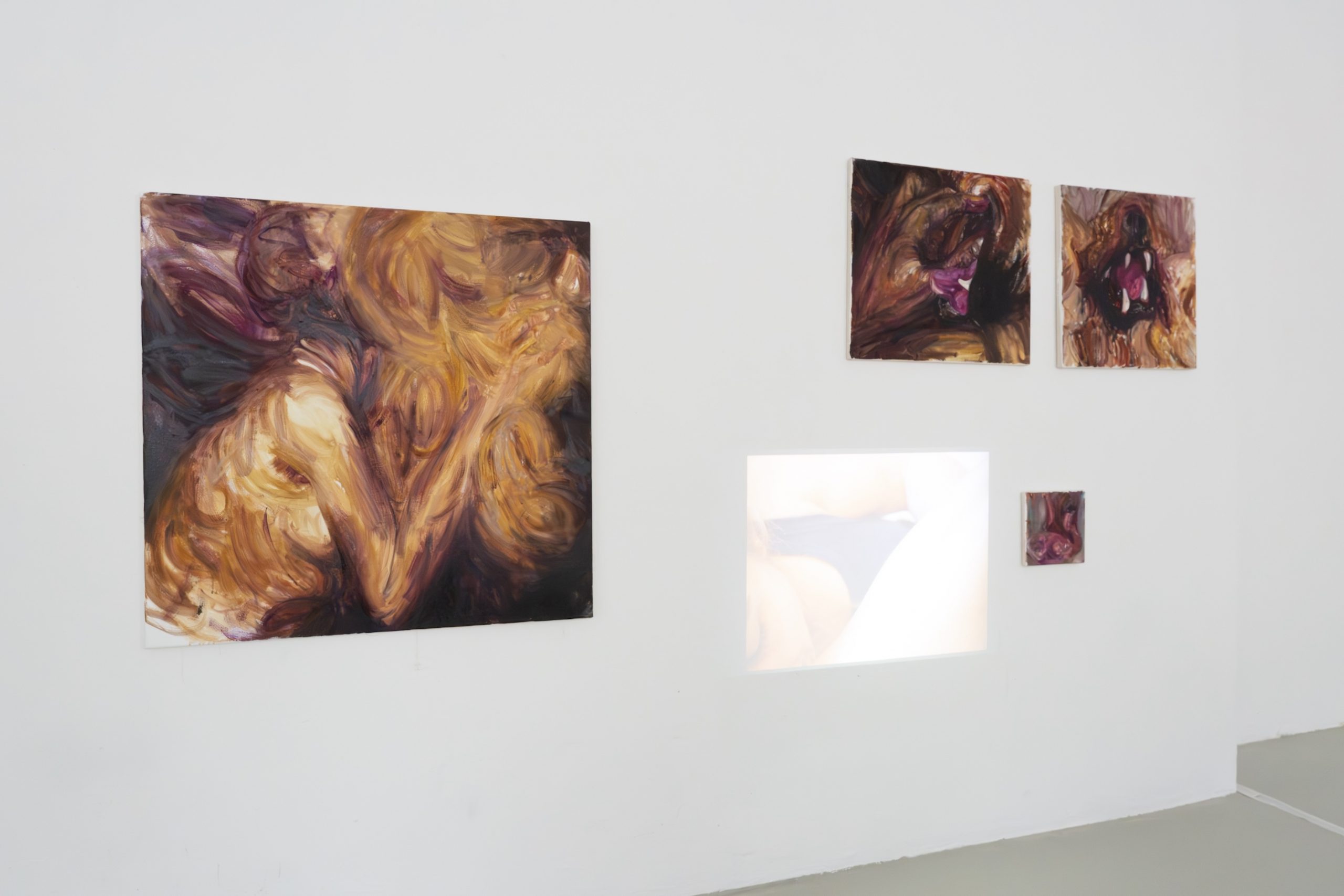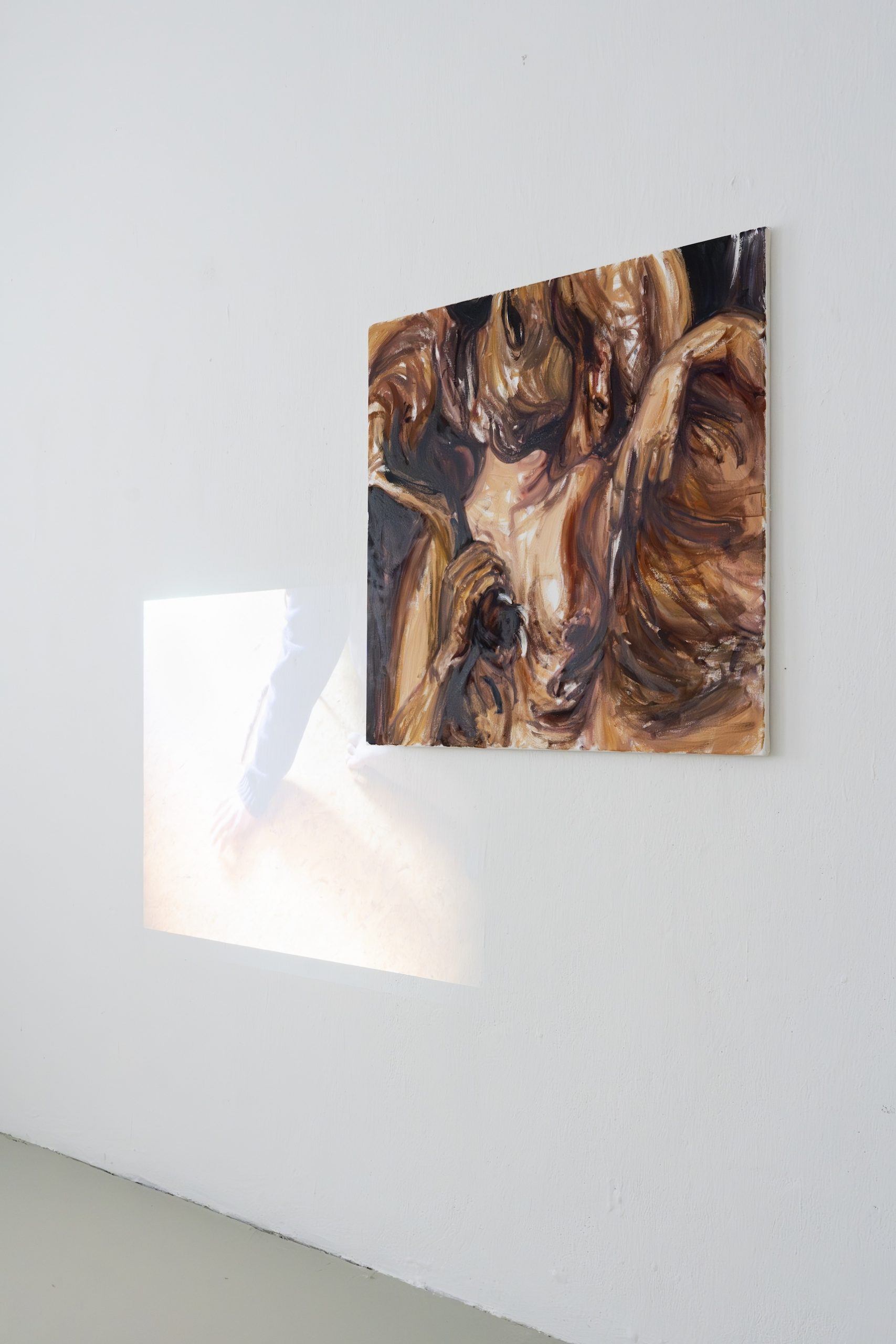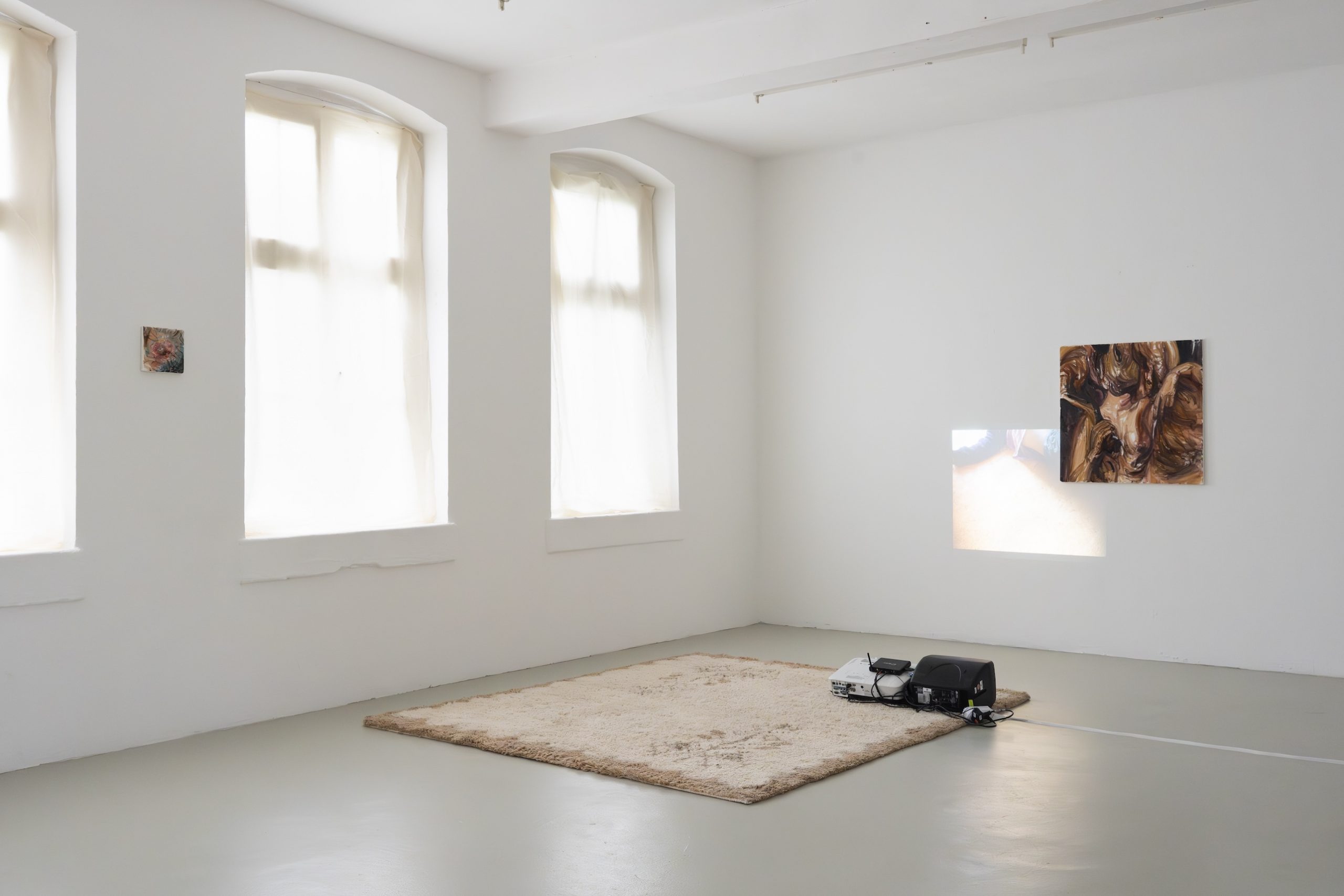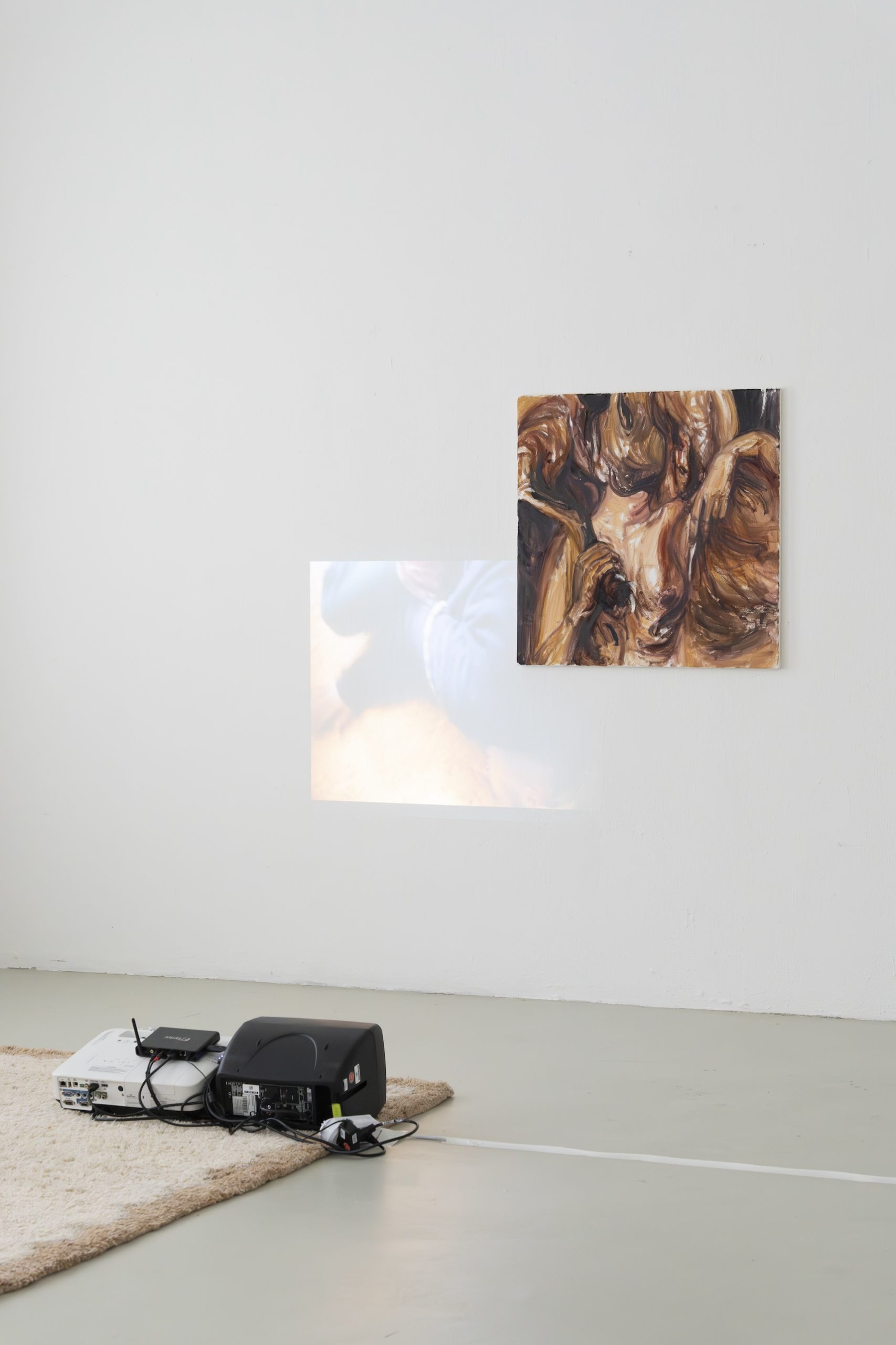 Ein auf drei Projektionen aufgeteiltes Video zeigte die Tänzerin Lena Valentina Hauth bei der Erkundung ihres eigenen Körpers und dessen tierischen Verknüpfungen. In mehreren Ölmalereien, die sich teilweise mit den Projektionen überschnitten, kam es zu Verschmelzungen verschiedenartiger Körper und Körperteile, deren Entzifferung durch das Spiel mit Nahaufnahme und Ausschnitt ähnlich wie im Film vielfältig blieb. In einer von Schmidt und der Sängerin Samira Mora Sosa angeleiteten Performance, kreierten die Besucher:innen gemeinsam den Soundtrack zur Installation. Die partizipative Performance ermöglichte Nähe und Verbindung auch zwischen Unbekannten, die auf ihrem Weg durch den Raum über ausgelegte Teppiche ihre Stimme in Einzellauten erklingen ließen und es schafften diese aufeinander abzustimmen.